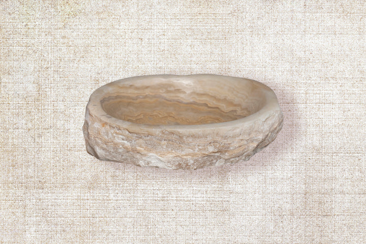 This is a statement decorative item and is highly versatile. This Onyx marvel can be used as a bowl for dry snacks, or decorate your tables, benches, and shelves. To highlight the polished top and raw edges of this bowl, place it on top of your coffee table books. Smoothly paired with any type of interior, leave it to the surrounding light to highlight its natural colors. Brut stands for Raw in French and this represents the spirit & letter of all what this bowl line represents.