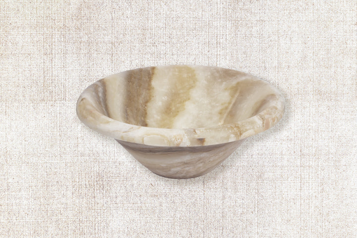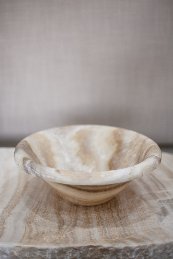 From our Classico Collection, this bowl's substantial size makes it a statement piece. Ideal for decorative use or as a functional centerpiece. Onyx, known for its translucent quality, gives the bowl an elegant, luxurious appearance, especially when illuminated. Its rich color variations and smooth texture provide a sophisticated touch to any space, whether placed on a table or countertop. The bowl’s weight and solidity offer both aesthetic appeal and practical use. This item is handcrafted, ensuring that each piece is one-of-a-kind.