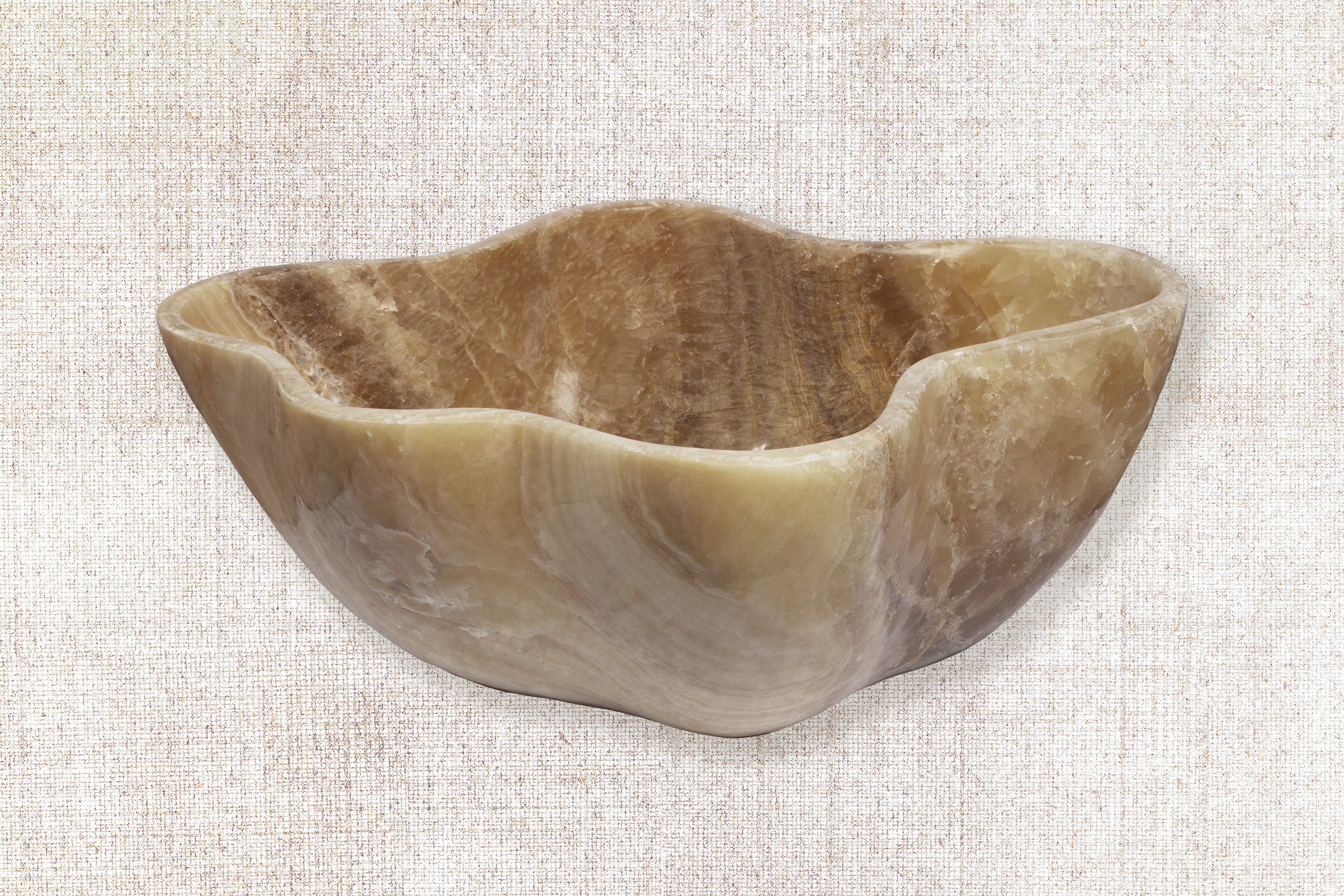 From our Courbe collection, this bowl's substantial size makes it a statement piece. Ideal for decorative use or as a functional centerpiece. Onyx, known for its translucent quality, gives the bowl an elegant, luxurious appearance, especially when illuminated. Its rich color variations and smooth texture provide a sophisticated touch to any space, whether placed on a table or countertop. The bowl’s weight and solidity offer both: aesthetic appeal and practical use. This item is handcrafted, ensuring that each piece is one-of-a-kind.