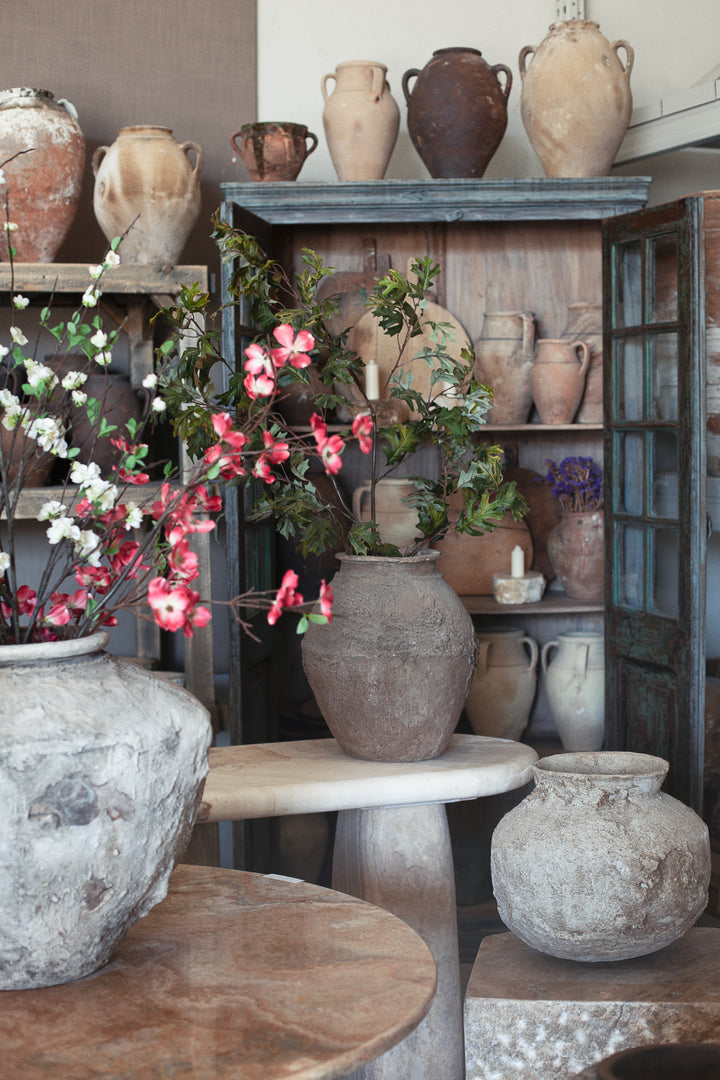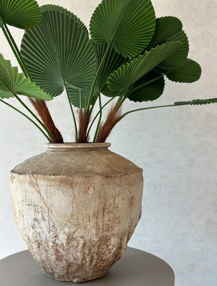 These vintage pots, once used to store water, are a testament to both utility and craftsmanship. Over time, they’ve developed a rich, weathered patina, each one showcasing its unique history. The coloration varies slightly, but gives each pot an individual character, reflecting a blend of nature’s influence and the craftsmanship that once shaped them. Each one feels like a snapshot of a bygone era, its scars and markings adding depth and richness to its story. Style these pots by placing them on a pedestal, side table, or entrance table to elevate their presence. For the finishing touch, fill the pots with either natural or artificial stems. These pots serve as well as planters for living plants.
