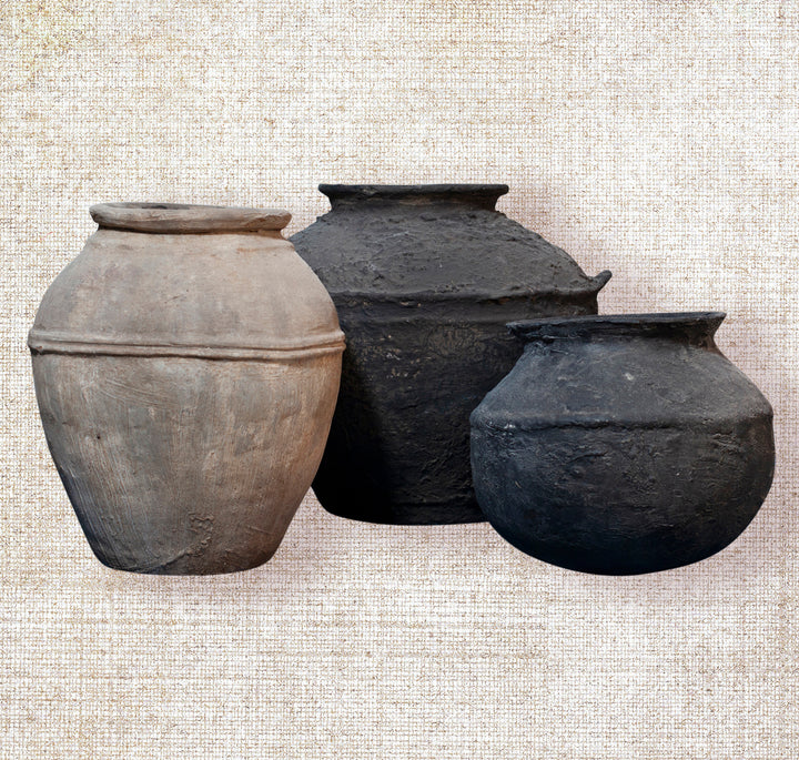 These vintage pots, once used to store water, are a testament to both utility and craftsmanship. Over time, they’ve developed a rich, weathered patina, each one showcasing its unique history. The coloration varies slightly, but gives each pot an individual character, reflecting a blend of nature’s influence and the craftsmanship that once shaped them. Each one feels like a snapshot of a bygone era, its scars and markings adding depth and richness to its story. Style these pots by placing them on a pedestal, side table, or entrance table to elevate their presence. For the finishing touch, fill the pots with either natural or artificial stems. These pots serve as well as planters for living plants.