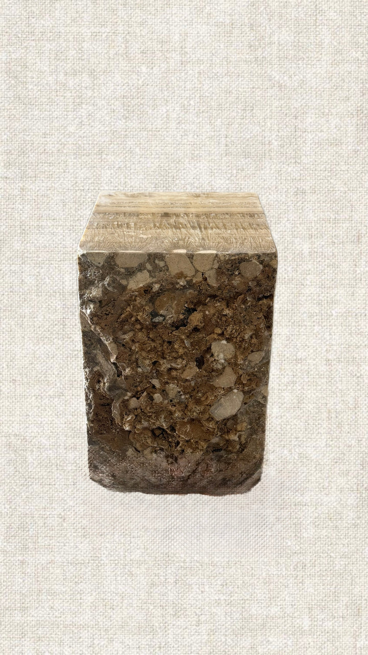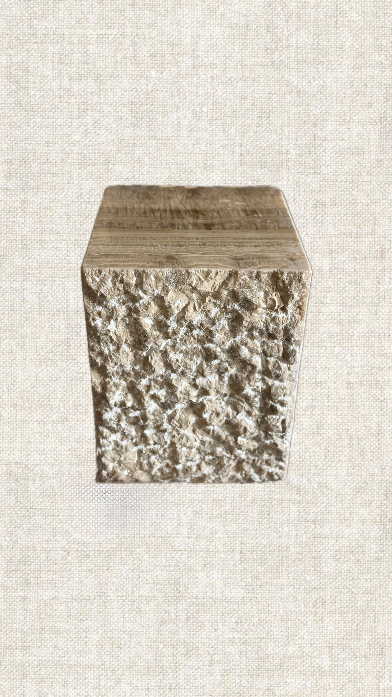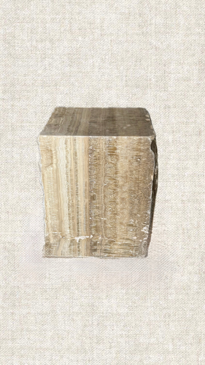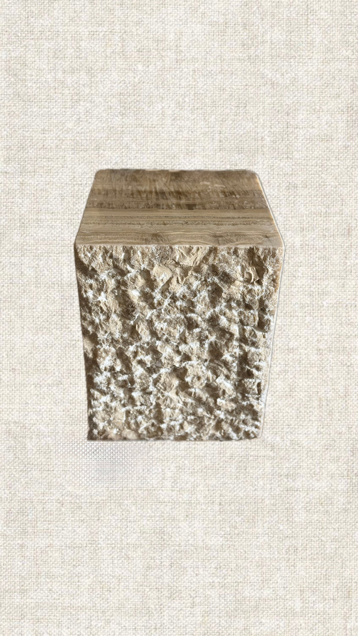 Kham in Arabic stands for Raw. This side table is handcrafted from a single block of onyx. Polished on 3 sides and kept raw on the other 2, this table is a must have. Highly versatile and can be used as a side table, pedestal, and/or stool. what makes this table stands out, is the contrast of polished vs. raw, contemporary yet classic, trendy yet timeless, minimalist yet maximalist in its inspiration. It's a table of choice to many international celebrities and interior designers...This table weighs between 120-180Kg. This item is handcrafted, ensuring that each piece is one-of-a-kind.