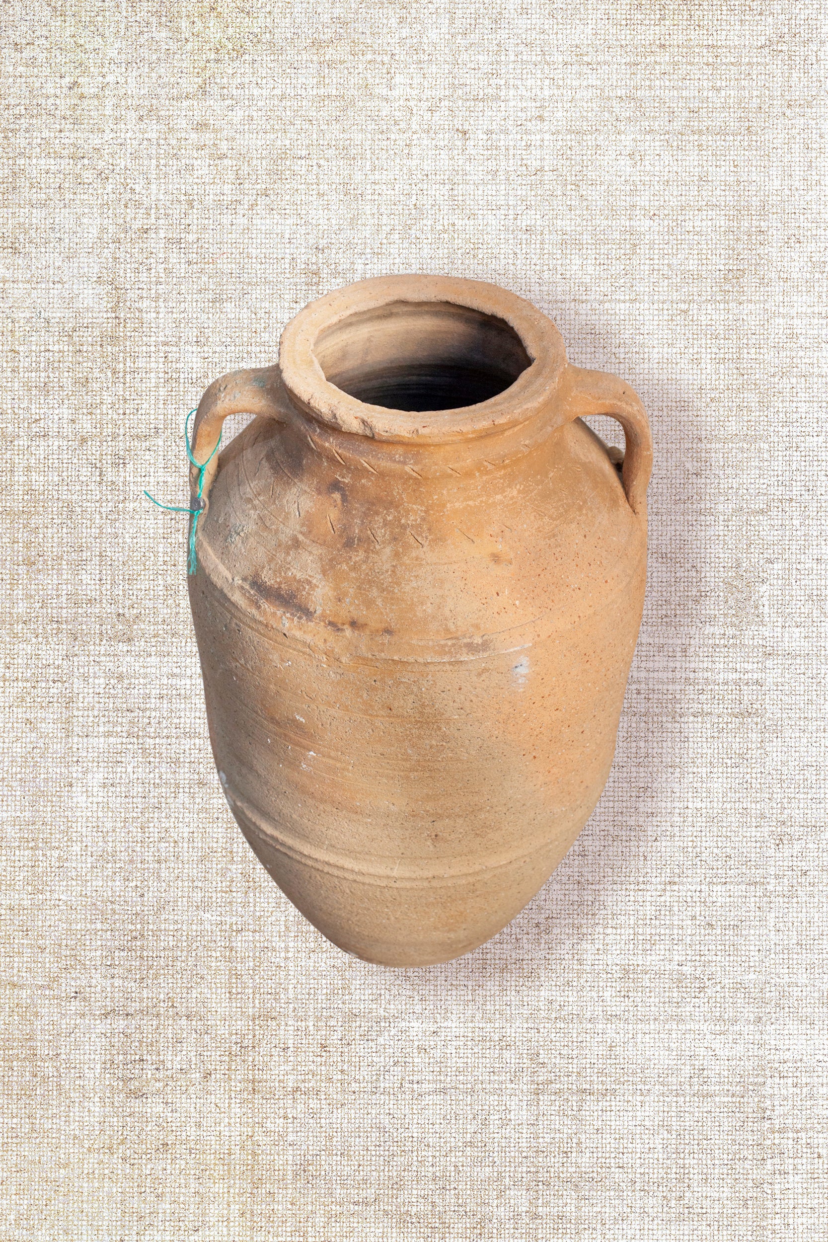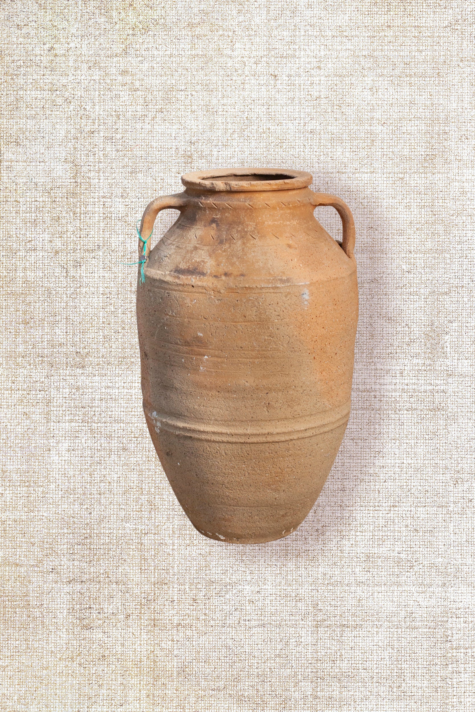 Once crafted for the purpose of holding olive oil, each piece boasts a unique character, having gracefully endured the passage of time. Celebrated as a stunning display item, style it by adding some stems or flowers and place it as a statement piece on a pedestal, entrance table, side cabinet or console table or position it as a focal point to bring life to your interior and soften the whole look and feel. This extraordinary object transforms any space into a gallery of history and artistry. Expect minor imperfections as a testament to its authenticity.