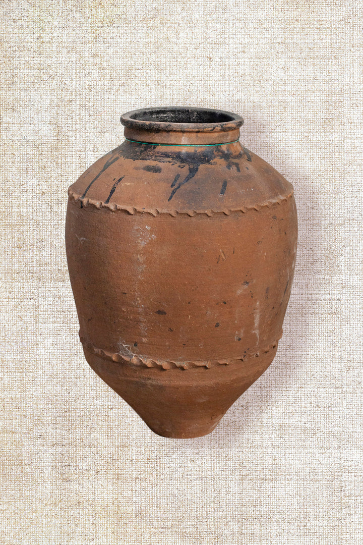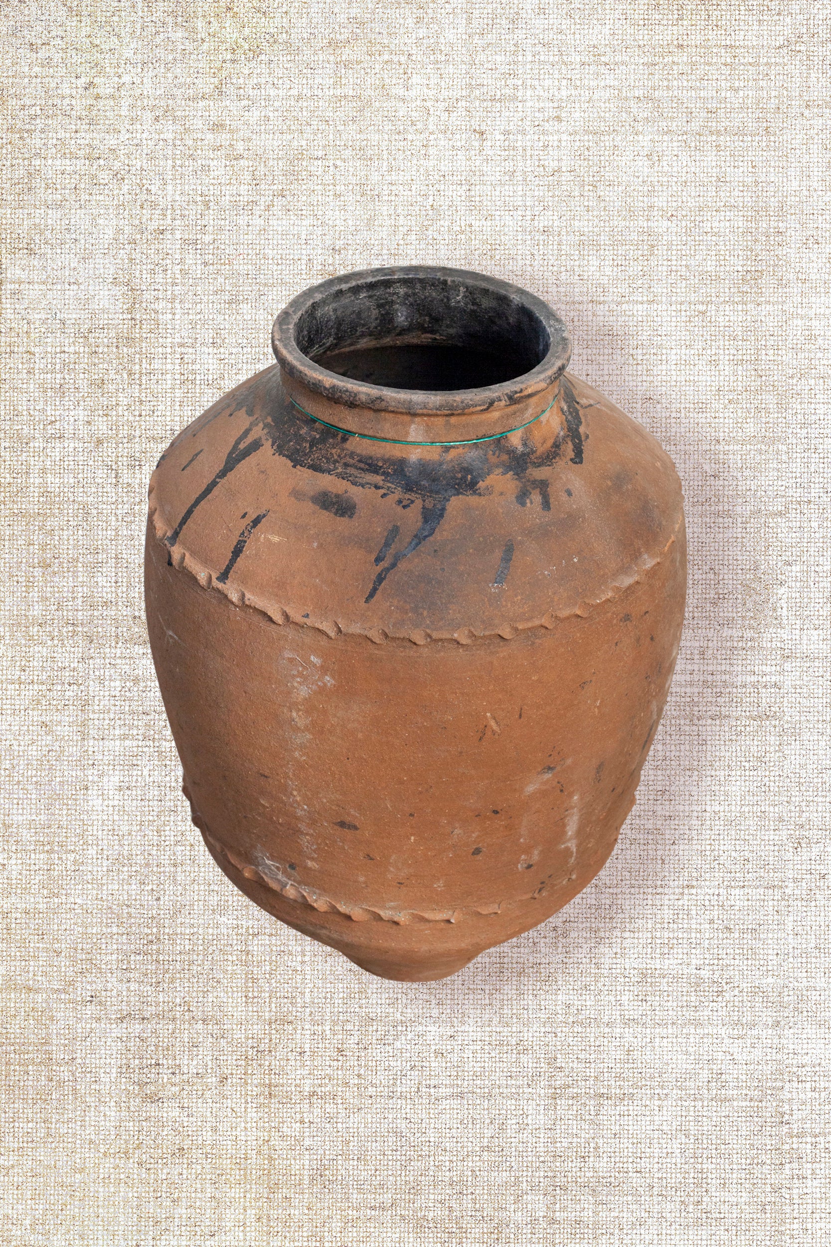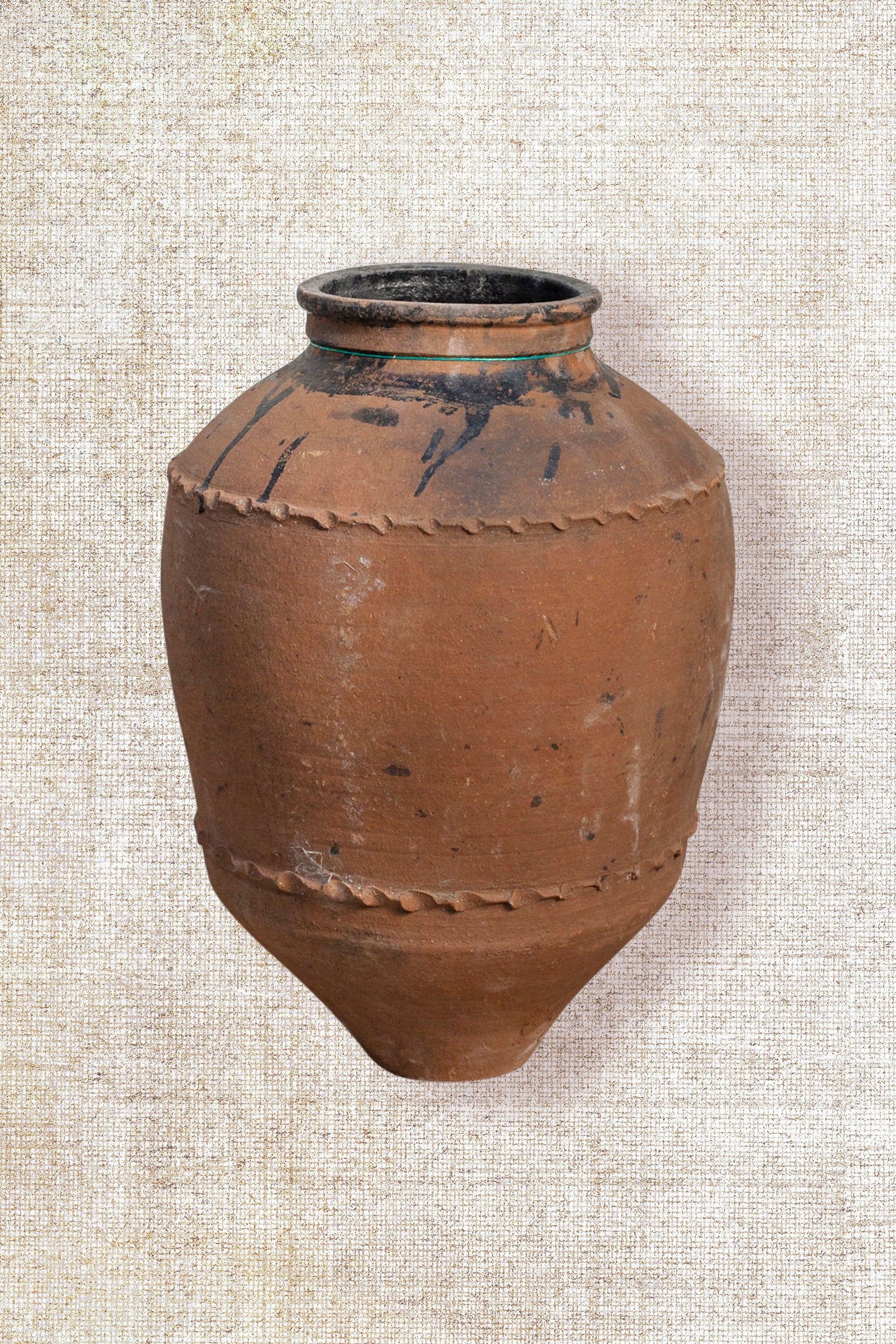 Once crafted for the purpose of holding olive oil, each piece boasts a unique character, having gracefully endured the passage of time. Celebrated as a stunning display item, style it by adding some stems or flowers and place it as a statement piece on a pedestal, entrance table, side cabinet or console table or position it as a focal point to bring life to your interior and soften the whole look and feel. This extraordinary object transforms any space into a gallery of history and artistry. Expect minor imperfections as a testament to its authenticity.