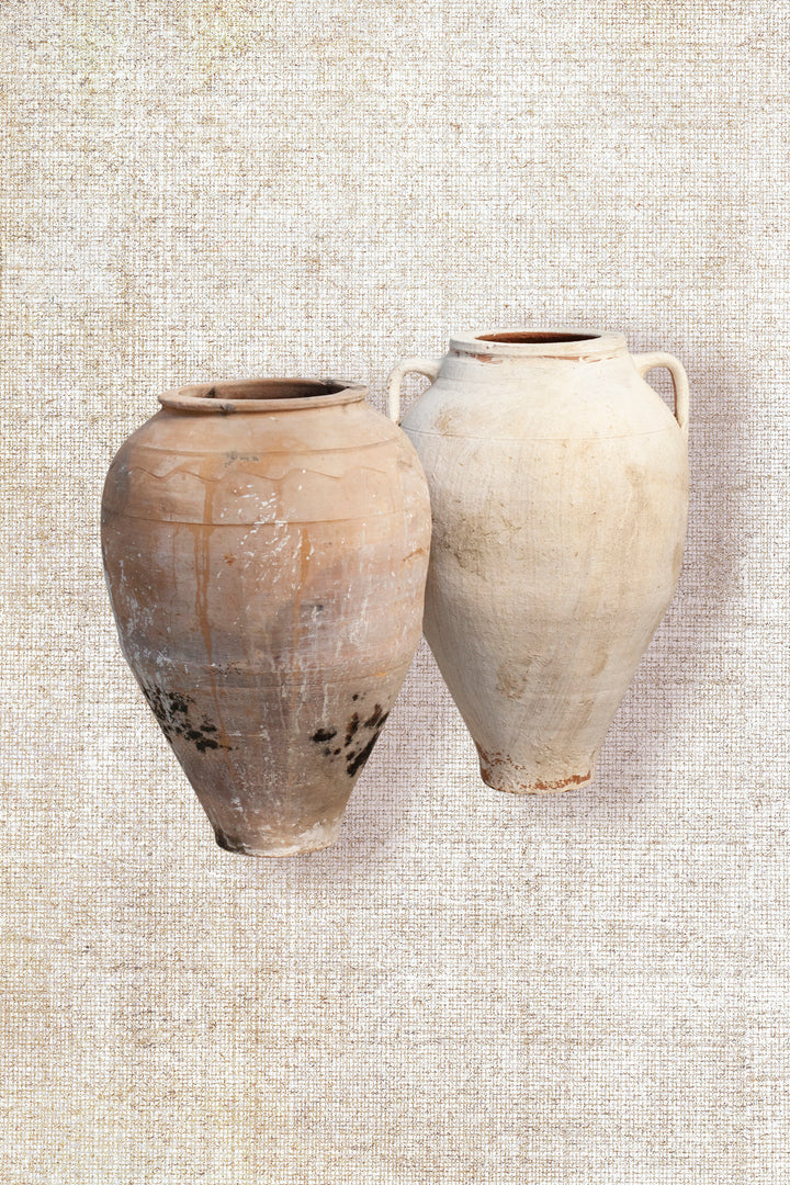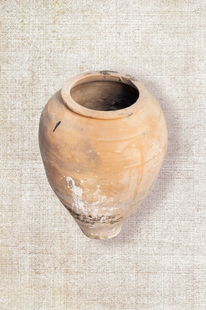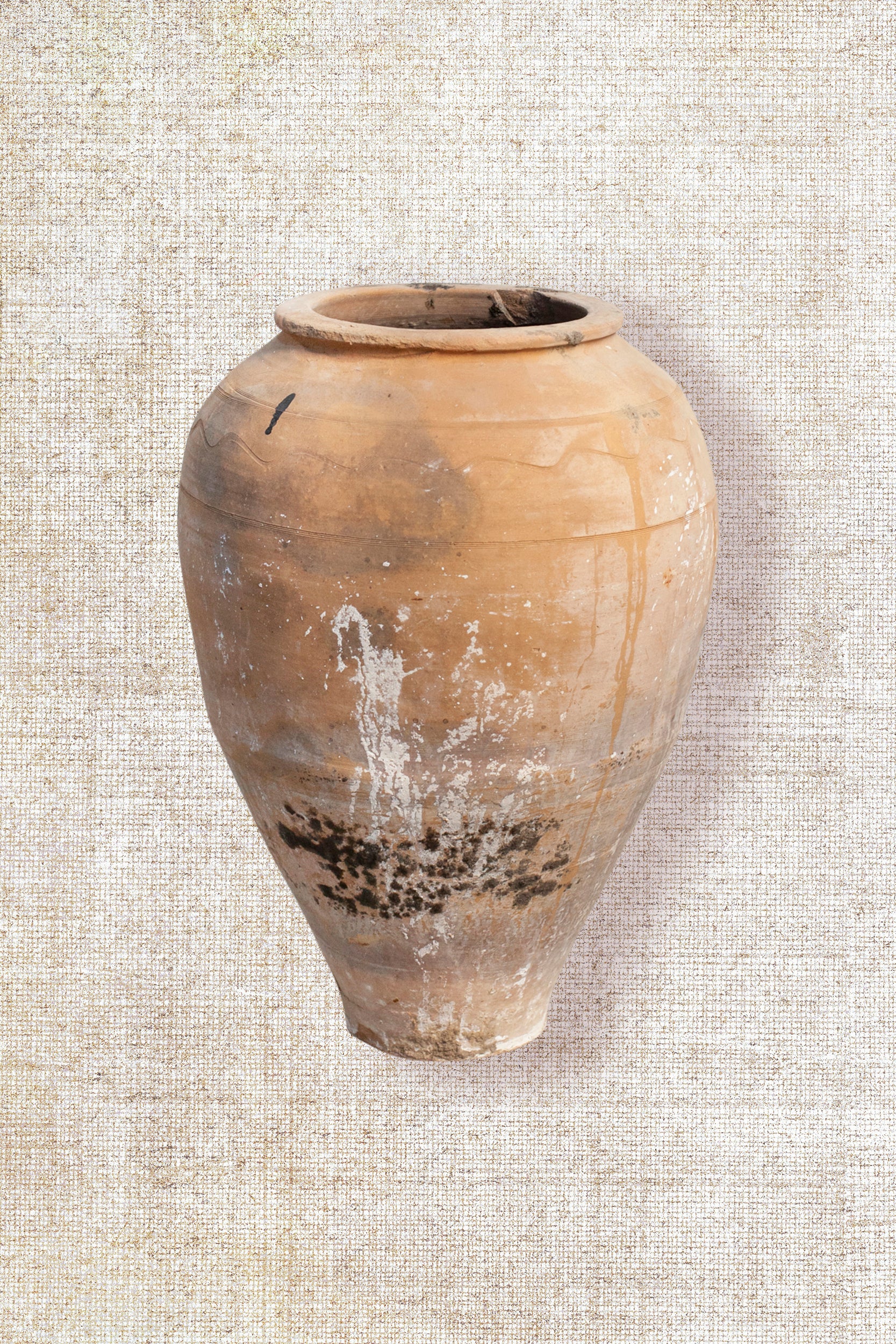 Once crafted for the purpose of holding olive oil, each piece boasts a unique character, having gracefully endured the passage of time. Celebrated as a stunning display item, style it by adding some stems or flowers and place it as a statement piece on a pedestal, entrance table, side cabinet or console table or position it as a focal point to bring life to your interior and soften the whole look and feel. This extraordinary object transforms any space into a gallery of history and artistry. Expect minor imperfections as a testament to its authenticity.