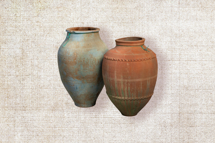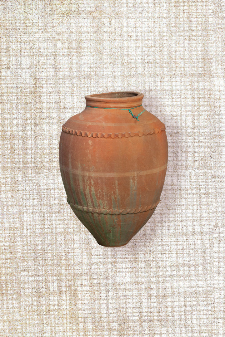 Once crafted for the purpose of holding olive oil, each piece boasts a unique character, having gracefully endured the passage of time. Celebrated as a stunning display item, style it by adding some stems or flowers and place it as a statement piece on a pedestal, entrance table, side cabinet or console table or position it as a focal point to bring life to your interior and soften the whole look and feel. This extraordinary object transforms any space into a gallery of history and artistry. Expect minor imperfections as a testament to its authenticity.