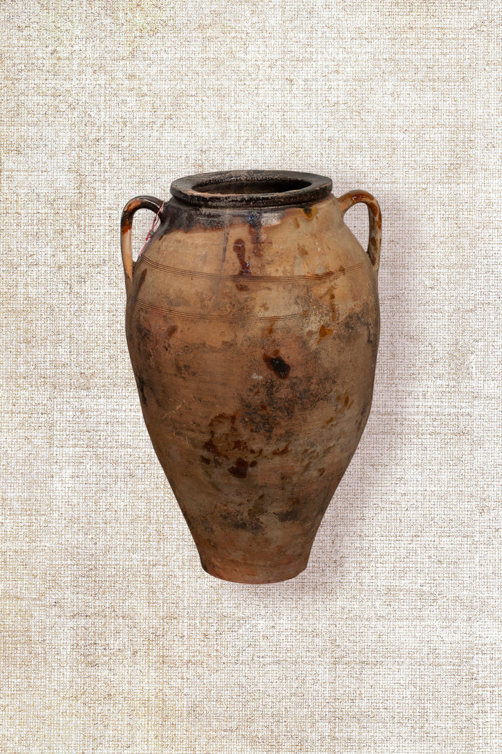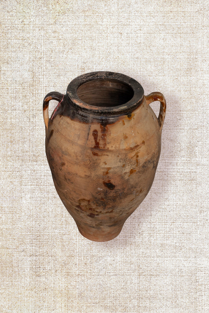 Once crafted for the purpose of holding olive oil, each piece boasts a unique character, having gracefully endured the passage of time. Celebrated as a stunning display item, style it by adding some stems or flowers and place it as a statement piece on a pedestal, entrance table, side cabinet or console table or position it as a focal point to bring life to your interior and soften the whole look and feel. This extraordinary object transforms any space into a gallery of history and artistry. Expect minor imperfections as a testament to its authenticity.