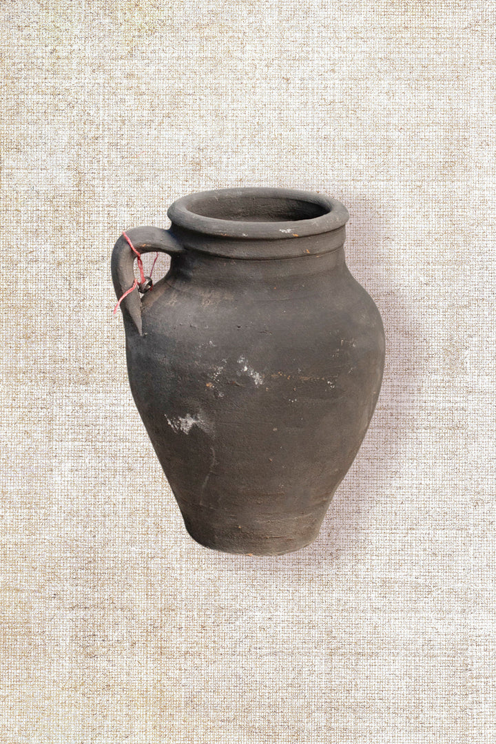 Initially intended for water storage, this rustic looking black distressed vase serves as a delightful decorative piece or container for dried branches and flowers.