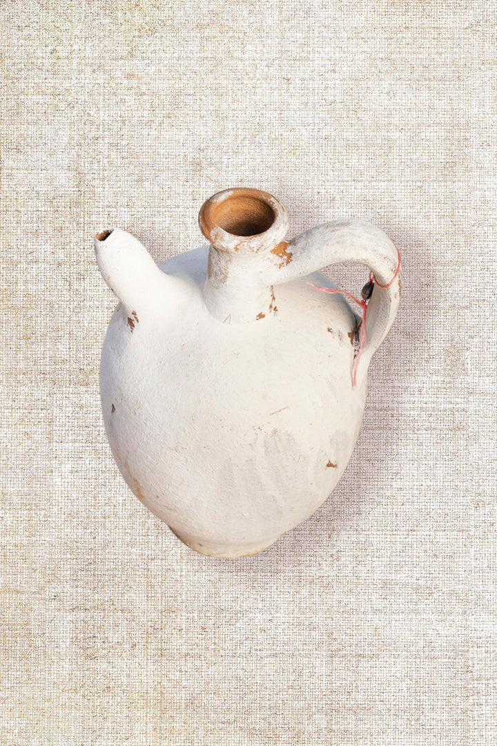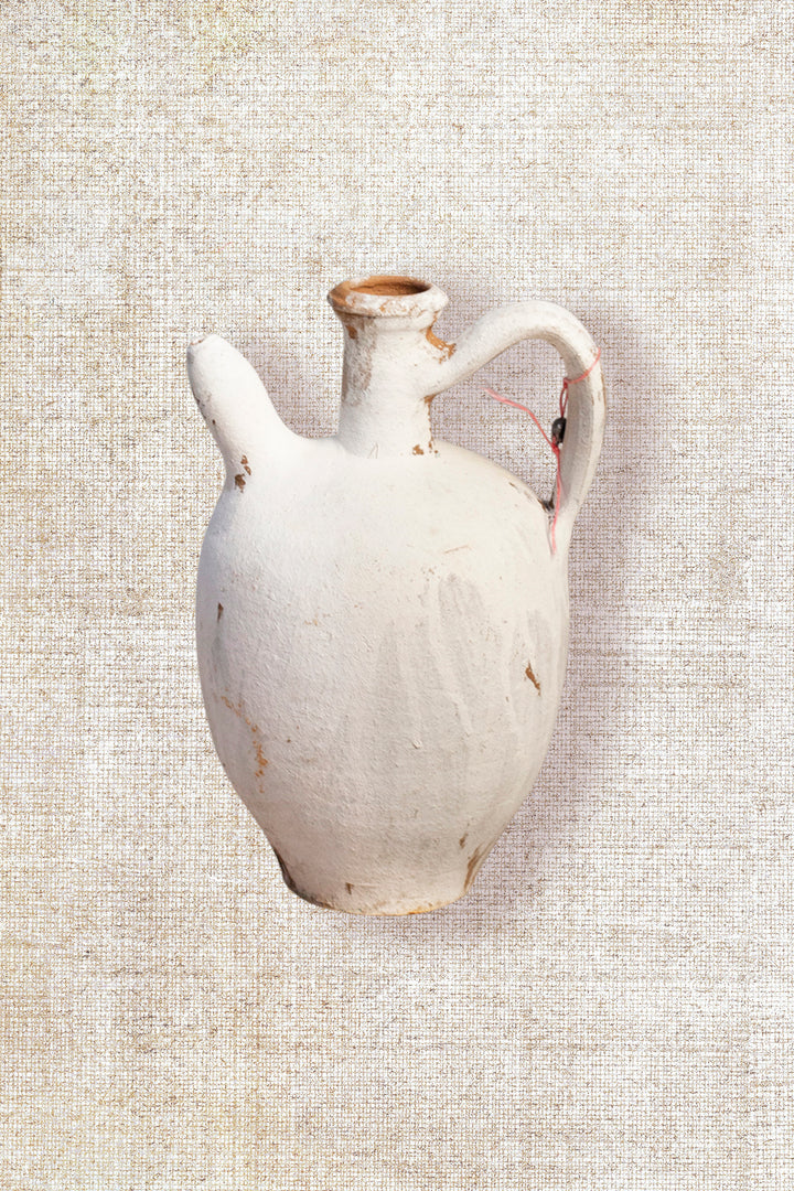 Initially intended for water storage, this classic white distressed jug serves as a delightful decorative piece or container for dried branches and flowers.
