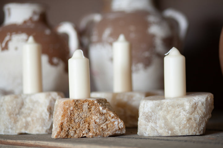 At Jērra, we are fueled by Nostalgia and raw living. Before humans invented light, nights were lit by the moon and by a stand carrying a burning candle. These candle stands are coming from a long lineage and ancestors who witnessed the most beautiful soirees, parties and love stories. It's simply raw, imperfect, durable, and beautiful to look at. The color difference is something that artisans appreciate as it's a natural output of the block that has been used. Can go well in bedrooms, living rooms, dining rooms, office, kitchens, and add an enduring and sustainable twist to your interior. Some come with a polished top or polished side, or totally raw. to each its own character and specifications. As the candle stands are handcrafted pieces, expect some variations in size. This candle stand can be nicely paired with "The Rock" to create different styling elevation.