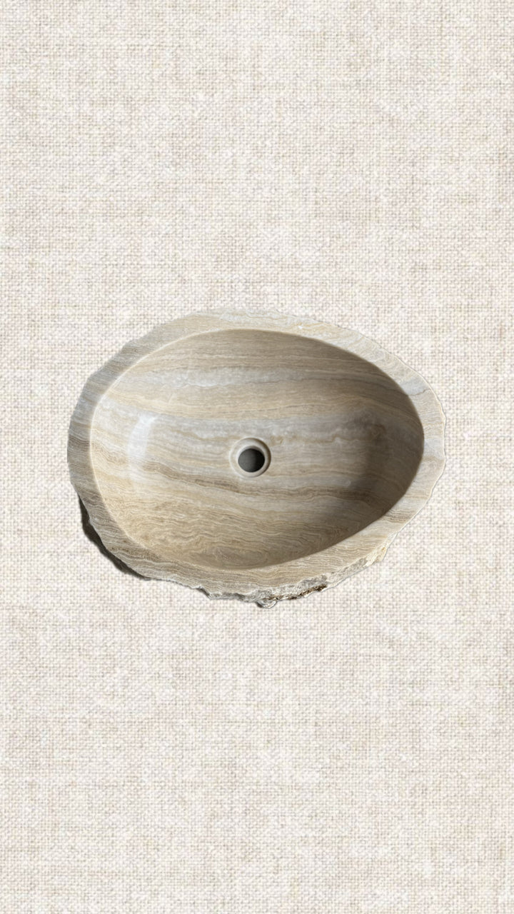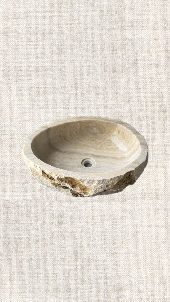 Handcrafted from a single block of Onyx. This sink's unique banding pattern and shape make it "the" inflecting object that elevates your powder room aesthetic and feel. Leave it to Natural or spotlight to highlight its translucent uniqueness.