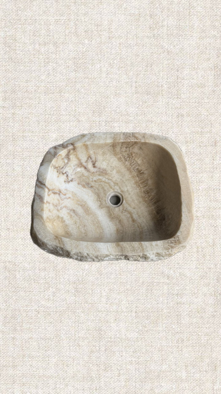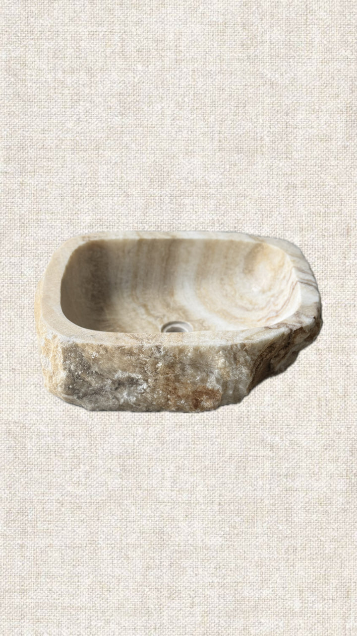 Handcrafted from a single block of Onyx. This sink's unique banding pattern and shape make it "the" inflecting object that elevates your powder room aesthetic and feel. Leave it to Natural or spotlight to highlight its translucent uniqueness.