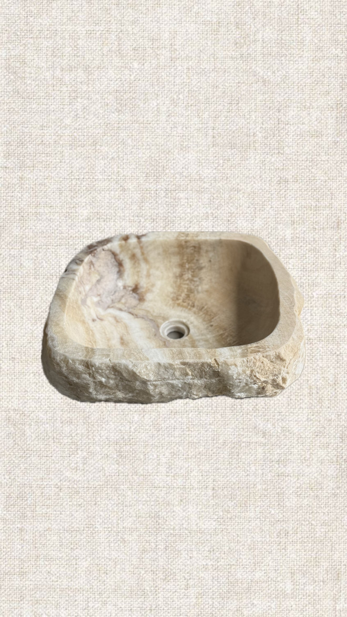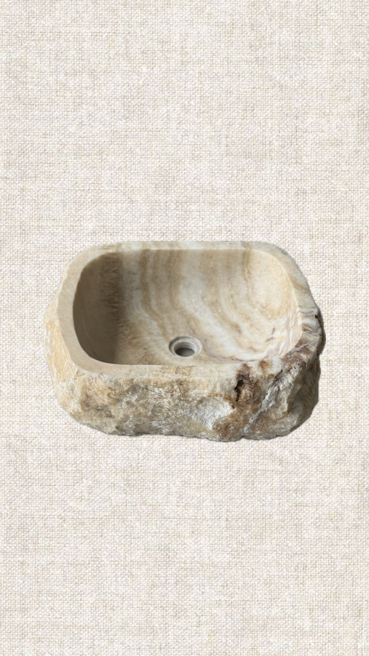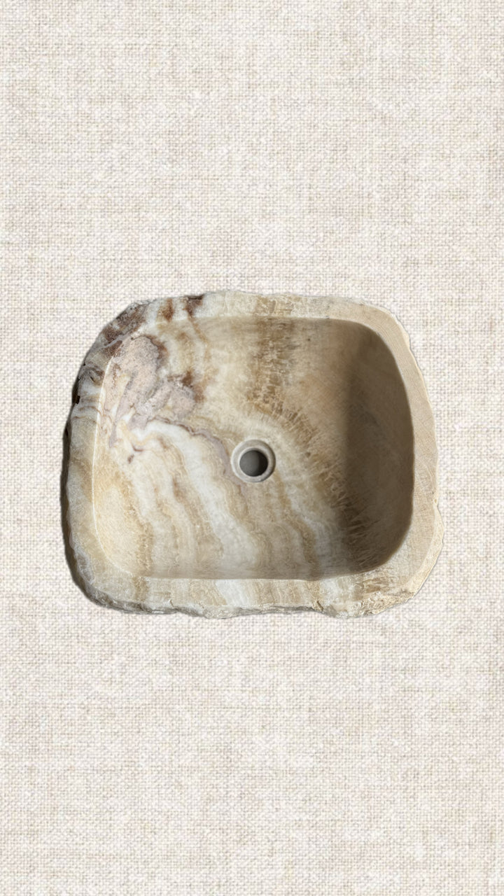 Handcrafted from a single block of Onyx. This sink's unique banding pattern and shape make it "the" inflecting object that elevates your powder room aesthetic and feel. Leave it to Natural or spotlight to highlight its translucent uniqueness.