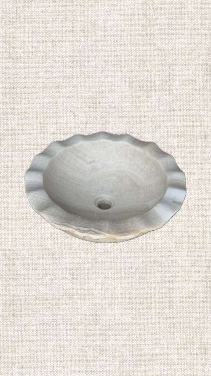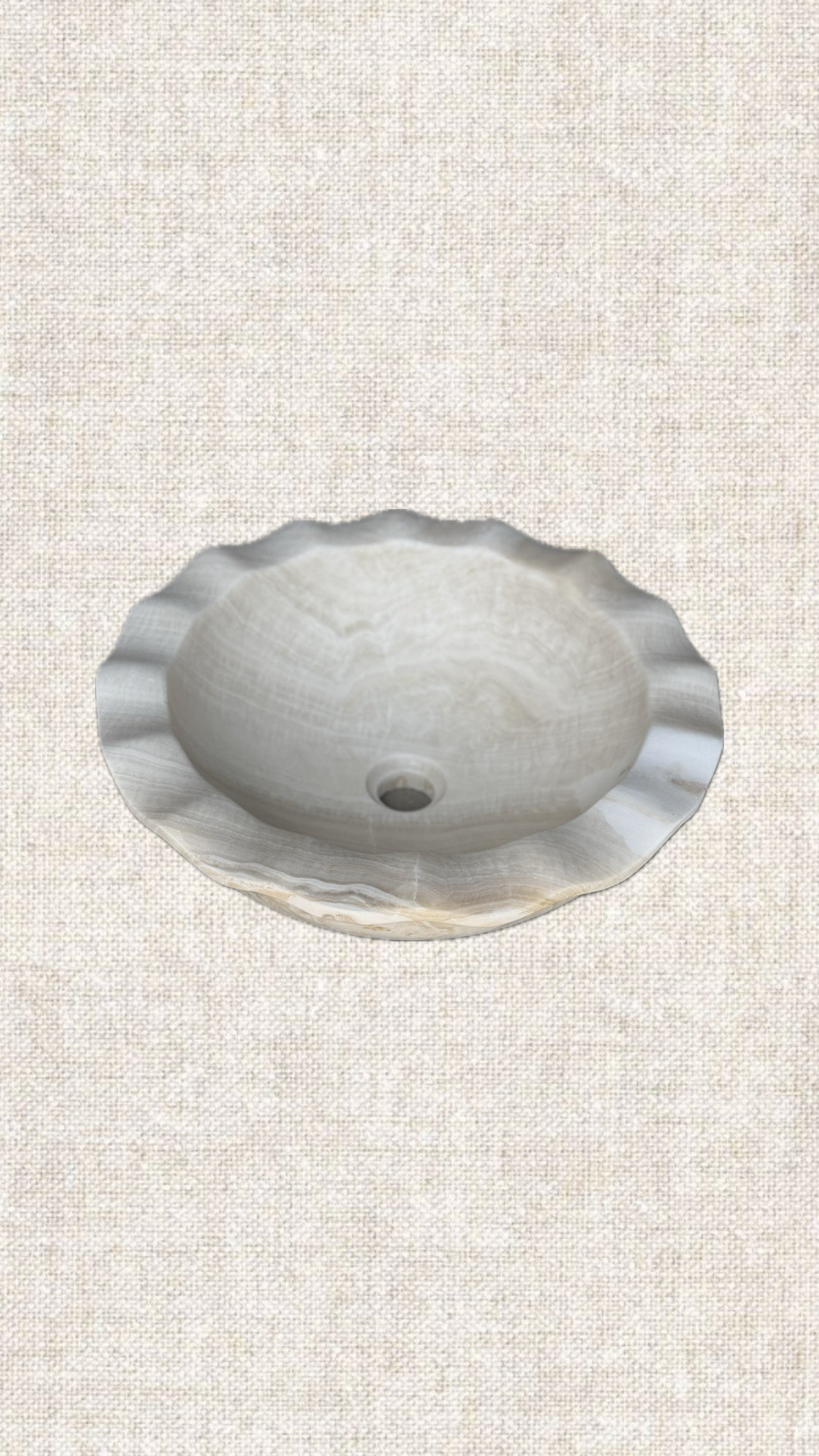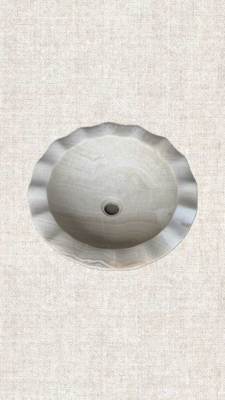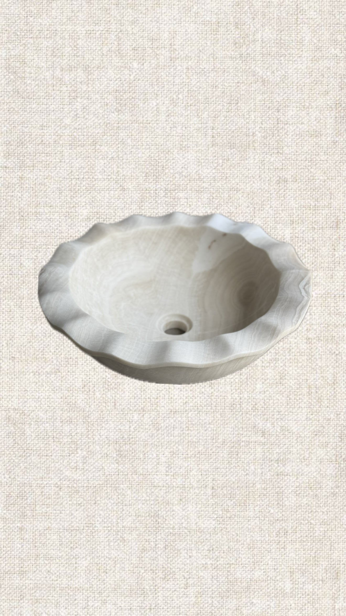 Our scalloped handmade onyx sinks from our Courbe collection embody timeless elegance. Crafted with precision to highlight the natural beauty of stone. Each piece showcases soft, flowing curves and rich variations in color and texture, turning a functional fixture into a statement of artistry. Elevated in design and detail, these sinks bring sophistication and warmth to any space, blending luxury with the uniqueness of hand-finished craftsmanship.