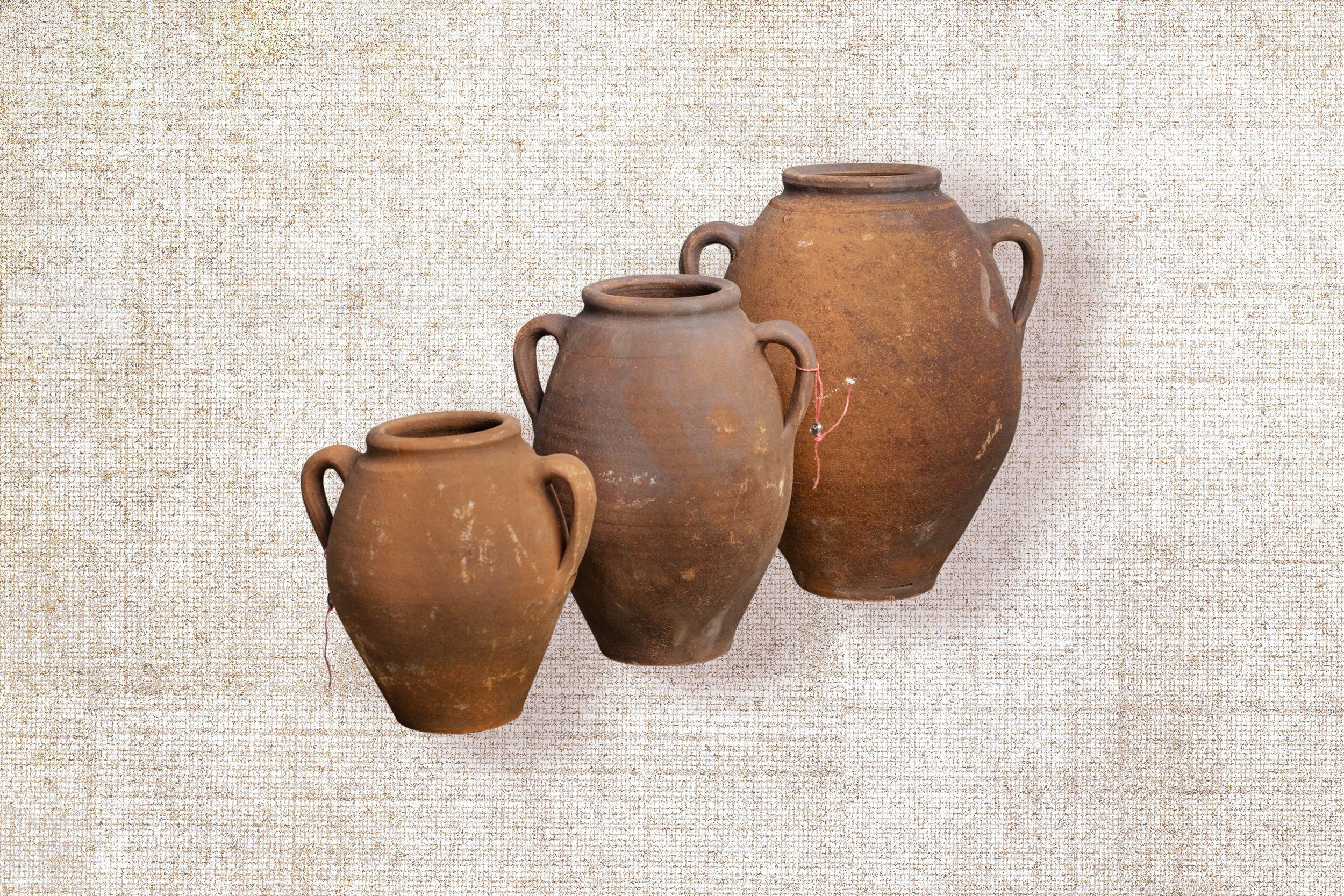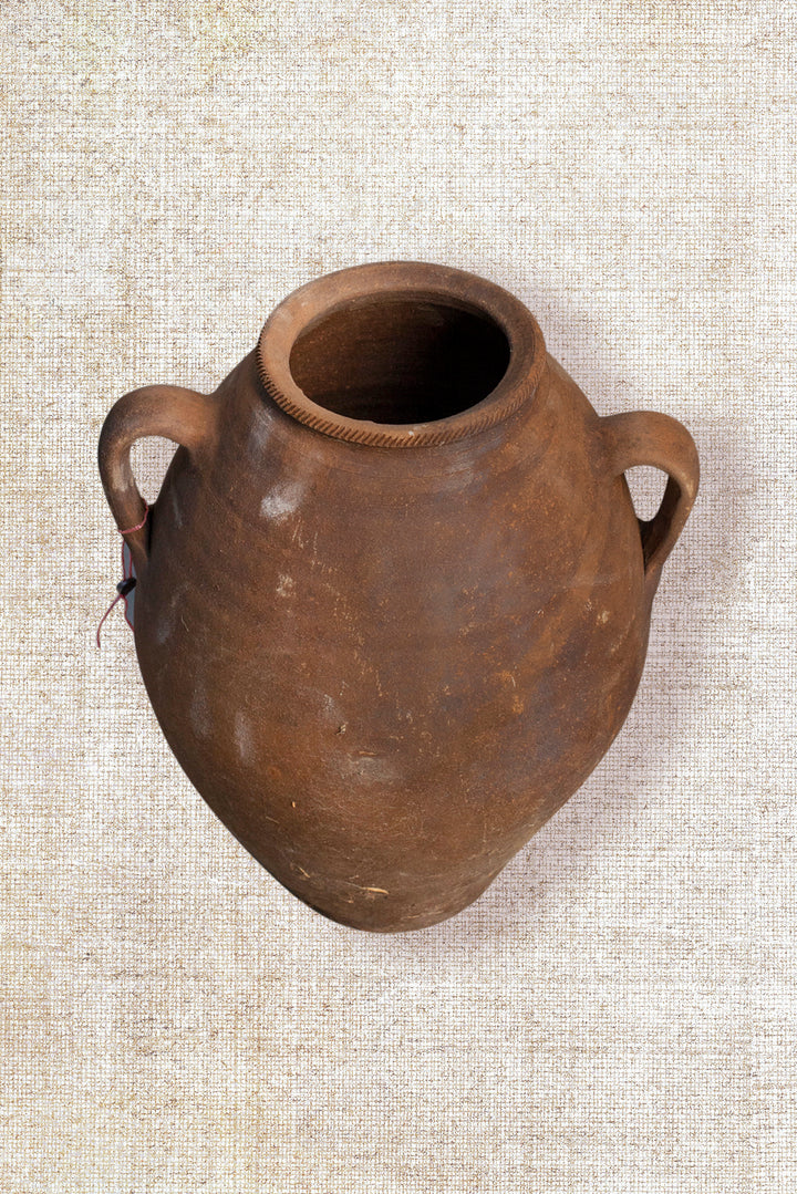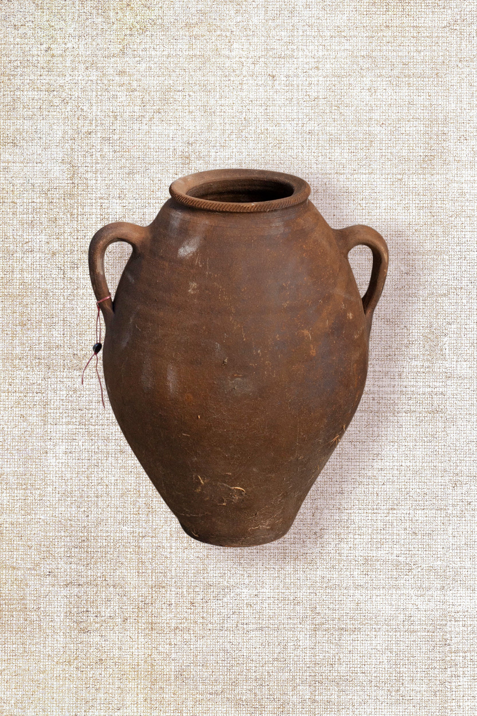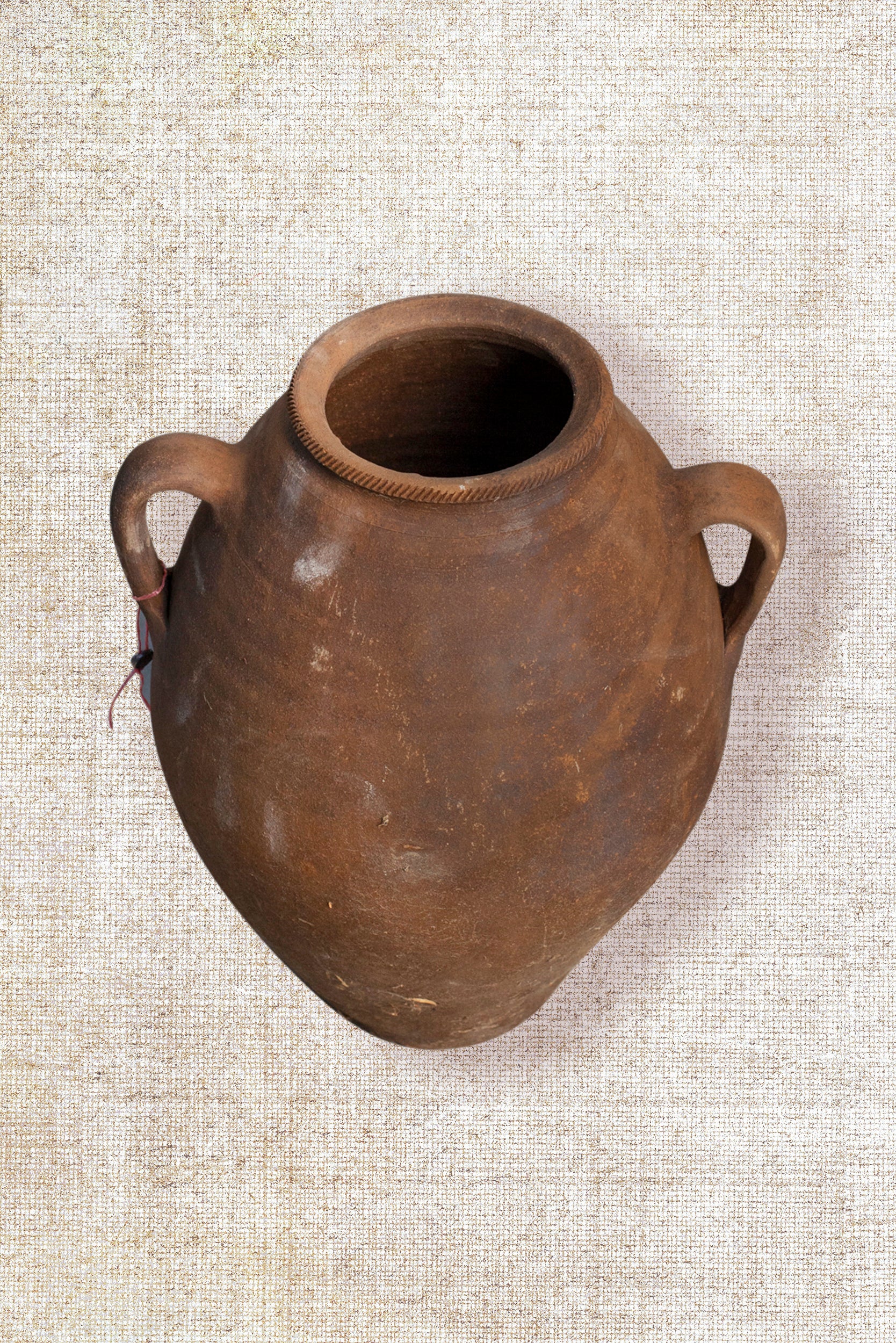 Initially intended for water storage, this rustic brown vessel, serves as a delightful decorative piece or container for dried branches and flowers.