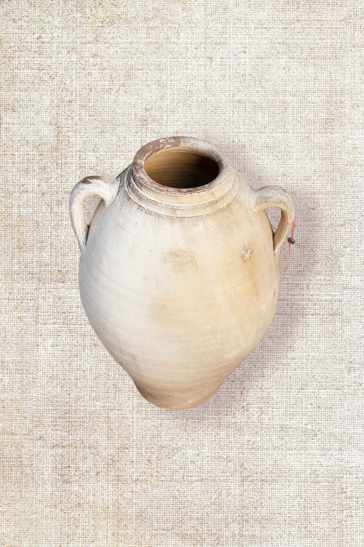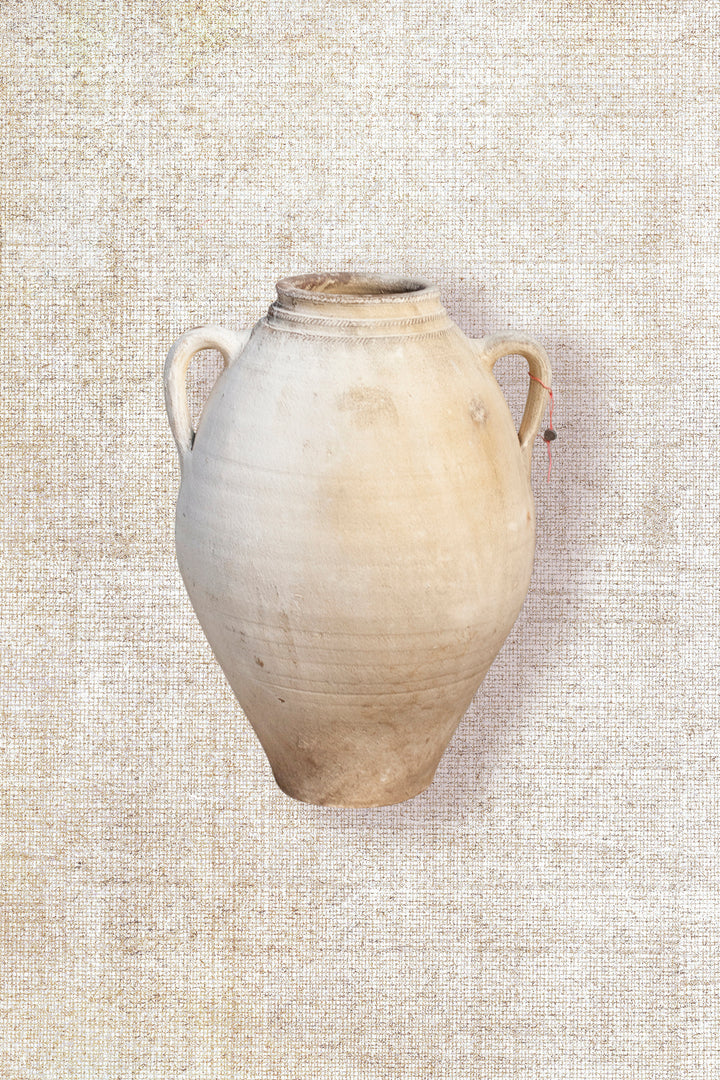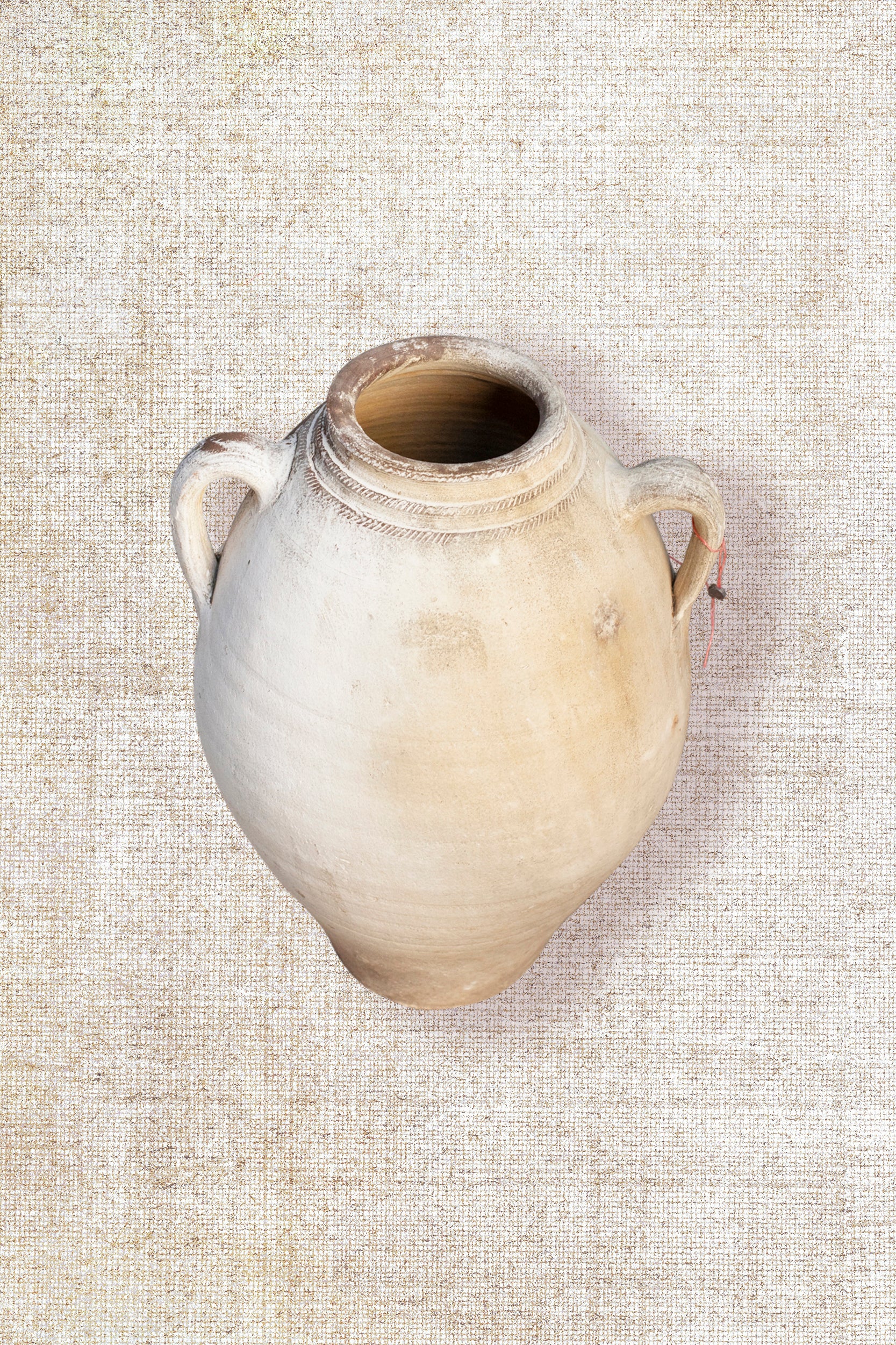 Initially intended for water storage, this two handles, white distressed pot serves as a delightful decorative piece or container for dried branches and flowers. To each of these pots a particular patina. Anticipate subtle differences in color.