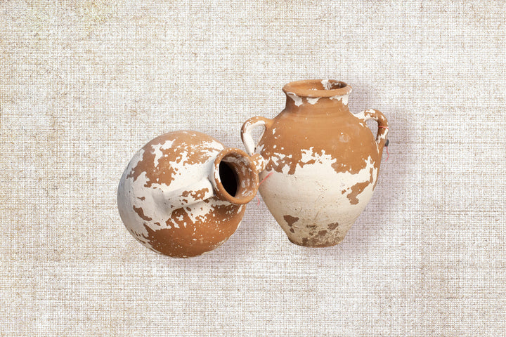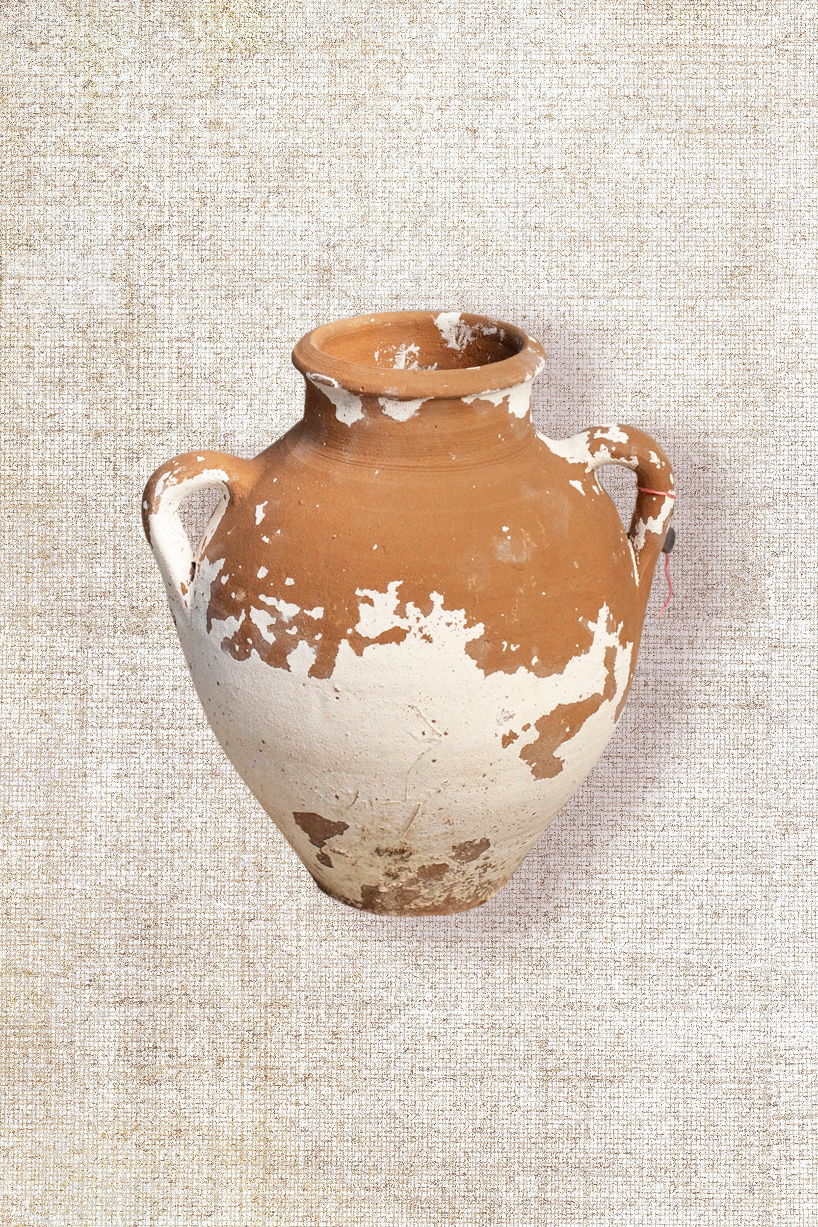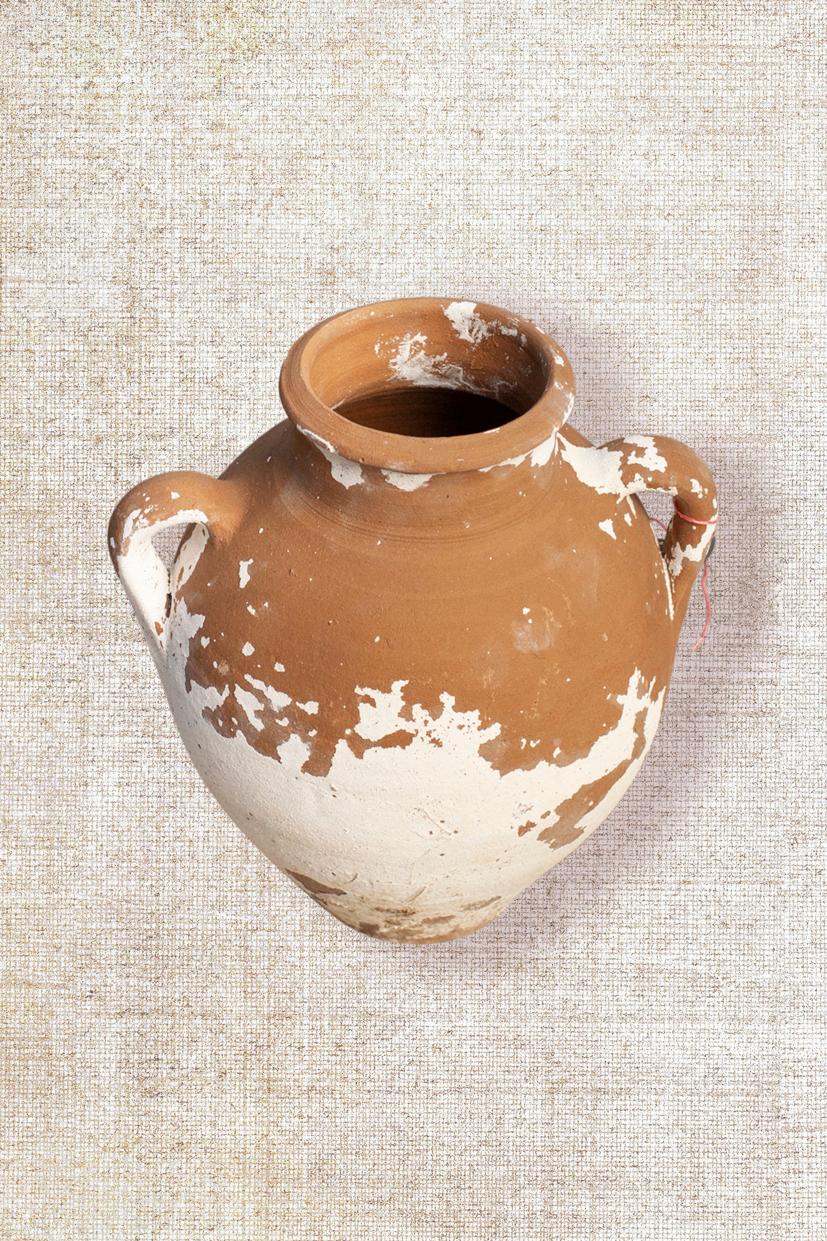 Initially intended for water storage, this classic whitewashed terracotta vase serves as a delightful decorative piece or container for dried branches and flowers.
