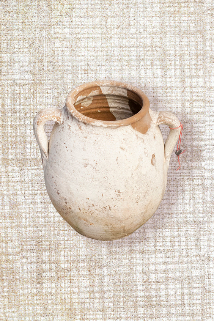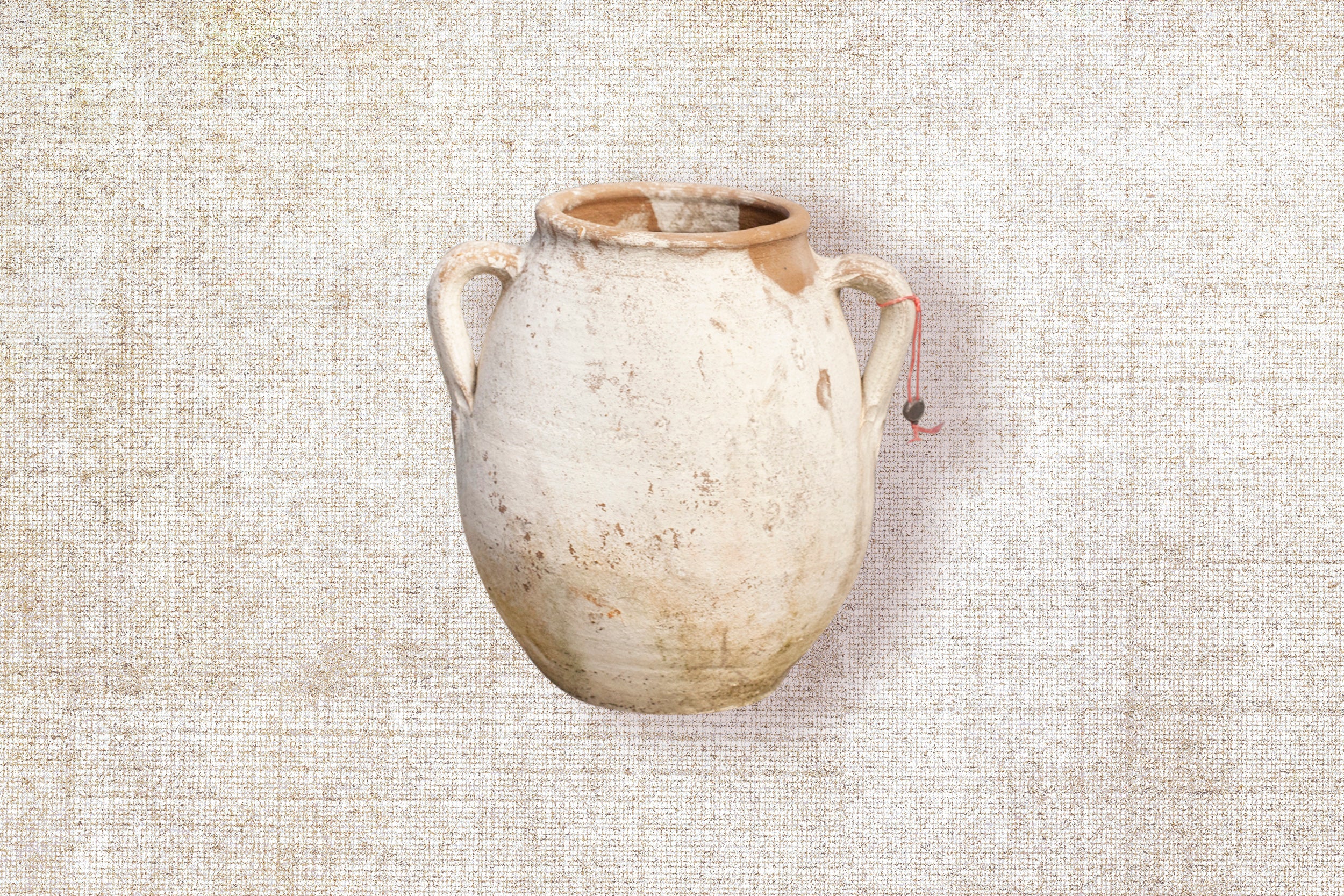 Initially intended for water storage, this classic whitewashed vase serves as a delightful decorative piece or container for dried branches and flowers.