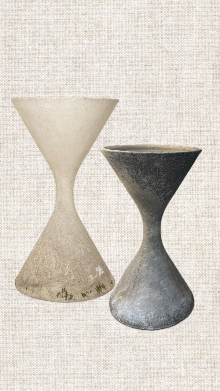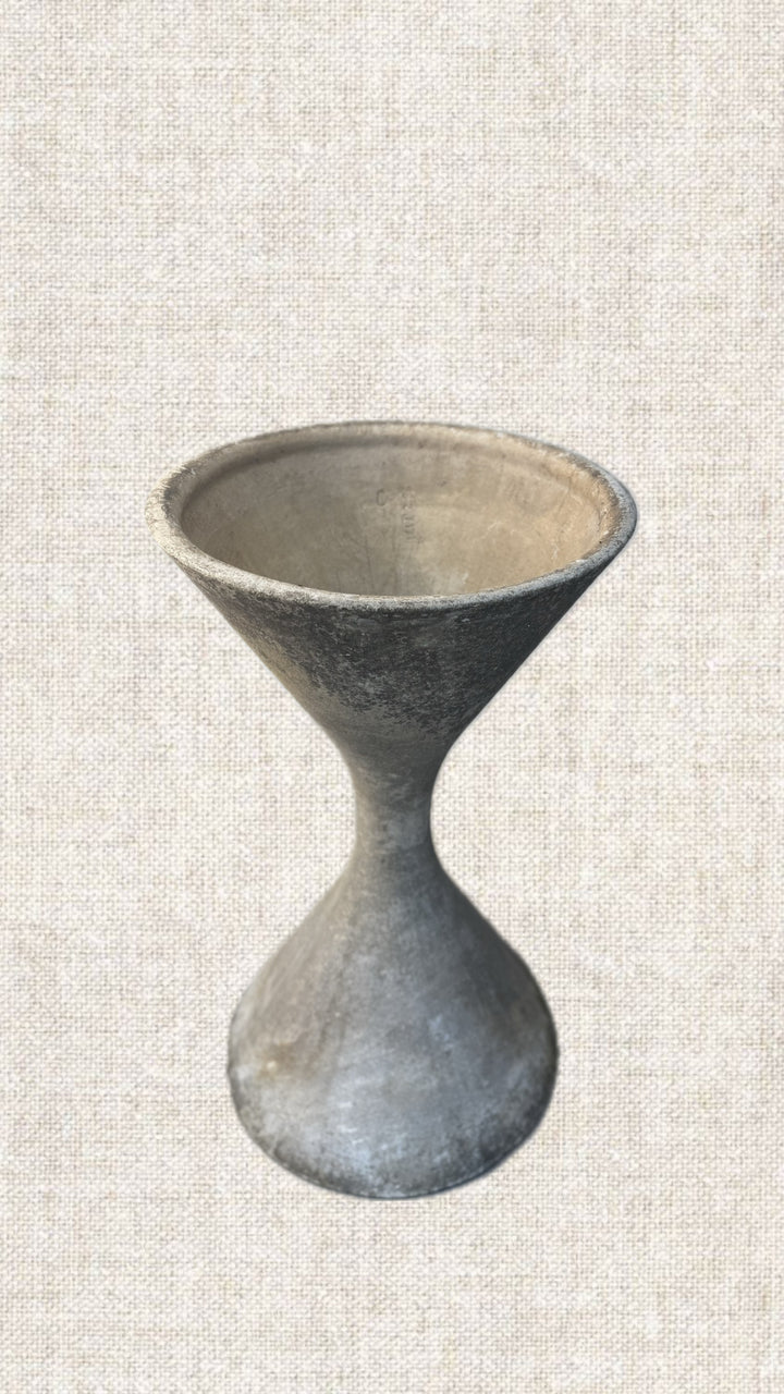 This piece was created by Swiss designer Willy Guhl, known for pushing the boundaries of outdoor design with sculptural, architectural forms. He frequently utilized robust materials such as concrete or Eternit, a fiber-cement composite originally developed by a Belgian manufacturer. Over the years, his work has gained recognition as collectible design. The vessel's curving, hourglass-like shape brings a sense of bold geometry and artistic flair, making it an eye-catching feature in any setting. It can be displayed as a planter or a sculptural object to enrich the character of a garden or outdoor space.